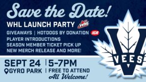 The Penticton Vees are excited to announce their WHL Launch Party celebrating their inaugural WHL season, which will take place Wednesday Sept. 24 at Gyro Park from 5 p.m. to 7 p.m. This will be an historic event that will live forever as we enter a new era of Vees hockey!