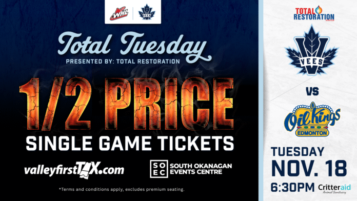The Penticton Vees announced today Total Tuesday presented by Total Restoration on Tuesday, Nov. 18 against the Edmonton Oil Kings. Puck drop is scheduled for 6:30PM.